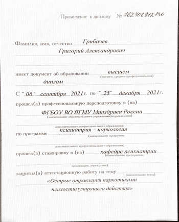 - Ординатура, специальность «Психиатрия-наркология» в ЯГМУ. 2020-2022г.